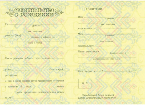 - свидетельство о рождении СССР 1950 - 1953 гг. любого года выпуска, включая времена СССР – а дополнительно к нему может прилагаться список предметов и оценок, которые можно выбрать по вашему желанию;